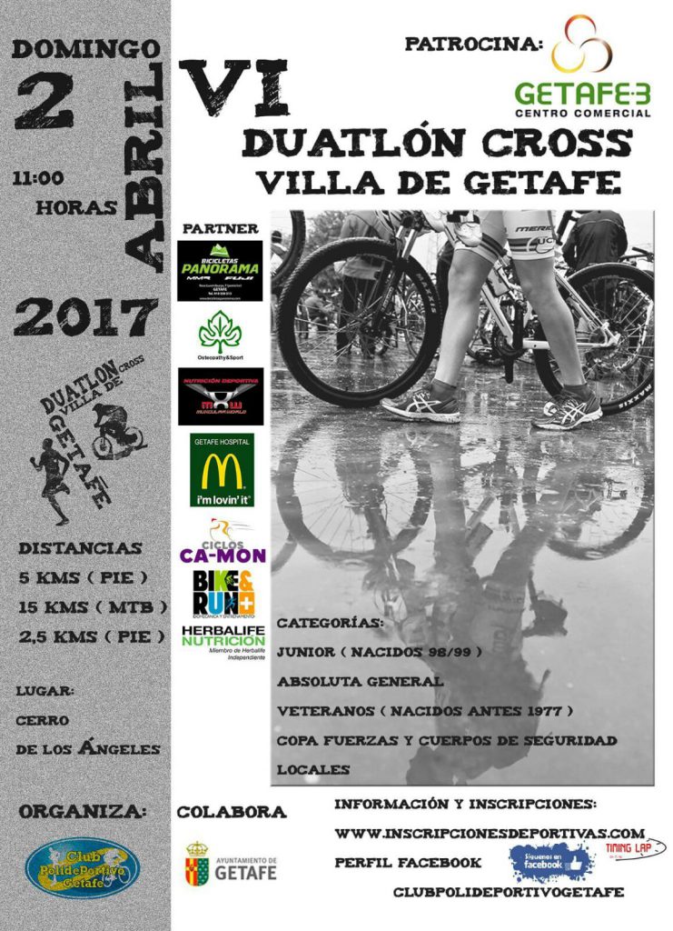 Martes, 07 de febrero de 2017.- Los aficionados al duatlón ya pueden inscribirse en la sexta edición del Duatlón Cross ‘Villa de Getafe’, que organiza el Club Polideportivo Getafe con la colaboración del Ayuntamiento de Getafe y el patrocinio oficial de Getafe 3 Centro Comercial, que se celebrará en el Cerro de los Ángeles el domingo 2 de abril a partir de las 11:00 horas.
